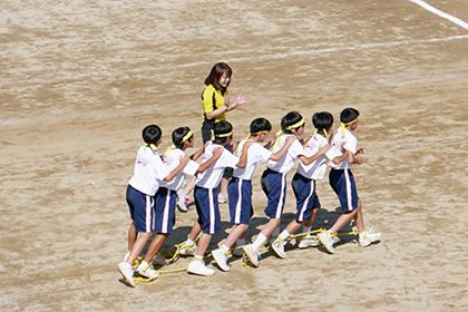 1年生の学年種目は「ムカデ競争」 朝練の成果もあり、素晴らしい連携で進みました。結果は1位3組、2位1組、3位2組でした。