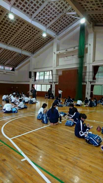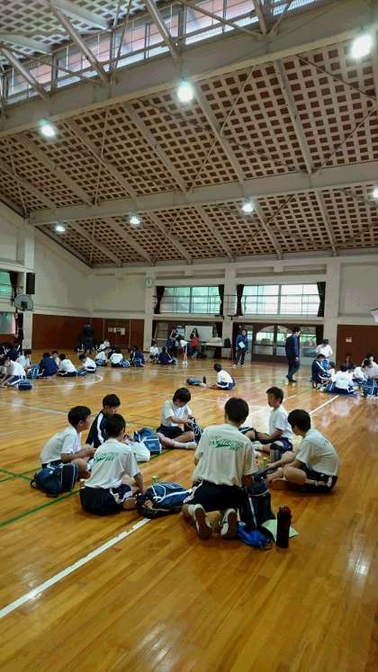 雨天のため、体育館での昼食となりました。午後の活動は山登りとオリエンテーションを変更し、レクリエーション活動となります。
