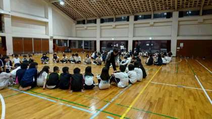 夕食を済ませ、夜のレクリエーション活動がスタートしました。テーマは、「団結の輪を広げよう」です。1番目は、ラインアップゲームです。出されたお題の順に円を作ります。