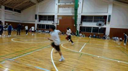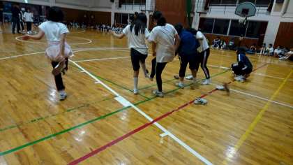 片方の足にスリッパをはき、スリッパをバトンにして反対の足で片足とびをしながらリレーで競います。
