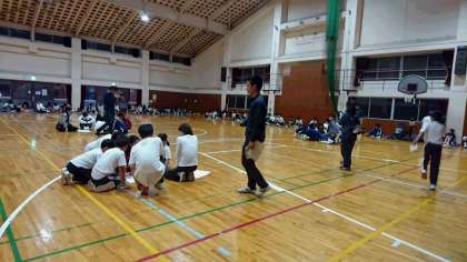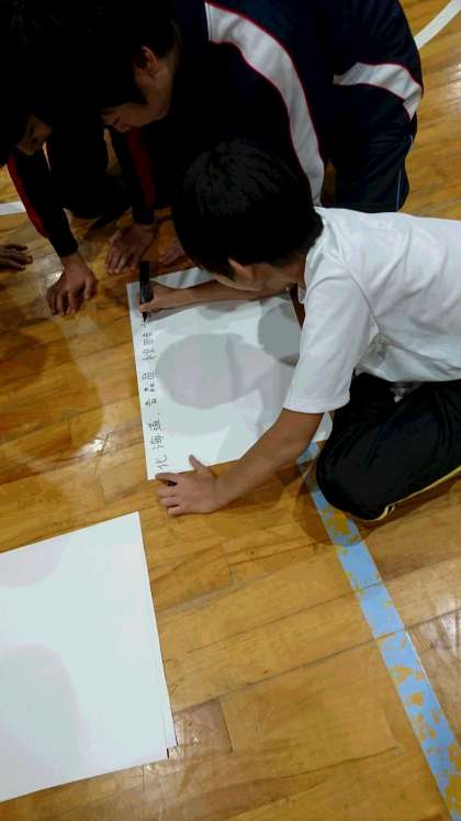 学級対抗、男女混合でお題の答えを相談して答えます。