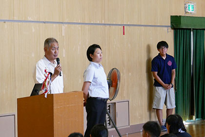 2学期が始まりました。始業式のあとに、体育科に新しく来られた岩藤先生の紹介と、賞状の伝達がありました。