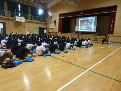 まずはじめに夏休み中の7月22日(日)〜8月6日(月)まで住之江区中学生の海外派遣事業カナダ(バンクーバー)への研修に参加した1年生の柳生凰介くんの発表会を行いました。現地の様子や体験したこと、学んだことなどの映像を織り交ぜながら発表しました。とても貴重な体験談を1年生みんなに報告してくれました。その後、青年海外協力隊員として海外へボランティア派遣された経験のある吉田悦子さんより派遣先の国の特長やボランティア参加への動機から学んだことについてご講話いただきました。1年生の生徒みんなにわかりやすく説明していただきました。