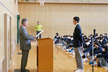 本日、終業式を行いました。冬休みに入りますが、体調管理に気をつけ、始業式には元気な顔を見せてください。