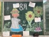 ピロティの行事黒板、8月バージョンが完成しました。風鈴、麦わら帽子、ひまわりと夏...