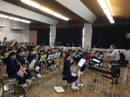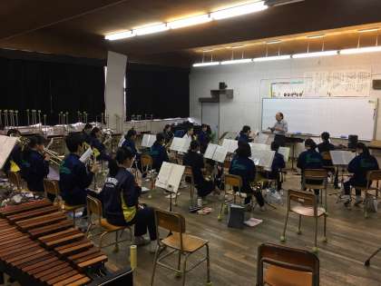 外は雨模様ですが、ゴールデンウィーク中も音楽室で活動に取り組んでいます。部活動指導員の先生にも来ていただいてがんばっています。