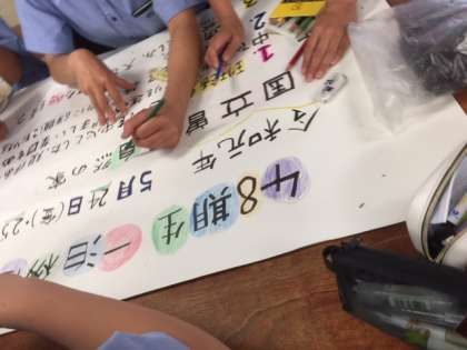 今日の放課後にレクリエーション係と班長も各教室に集まって、一泊移住当日に向けて全体がしっかり動けるように、注意事項や二日間の行程、一泊移住の目的を模造紙にまとめてくれました。