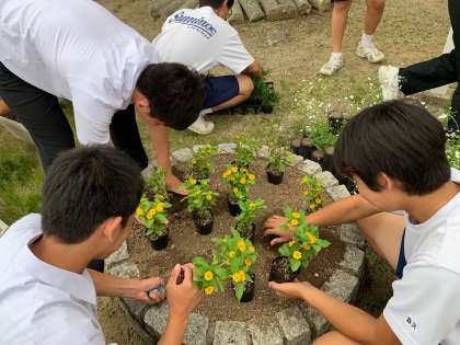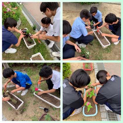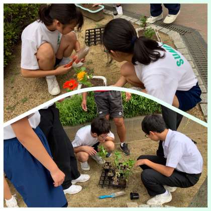 放課後に、生徒議会の生徒が、先日区役所を通じていただいた、花の苗を、花壇やプランターに植え替えてくれました。学校の環境整備に力を発揮してくれました。
