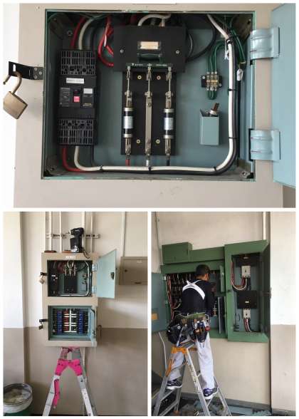 分電盤のヒューズをスイッチ式のブレーカーに交換する工事を行っています。もうすぐ創立50周年ということで、施設も老朽化しており、点検や補修が必要です。
