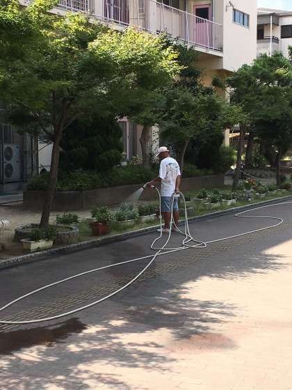休日にもかかわらず、管理作業員さんが花の水やりをしに学校にきてくれています。