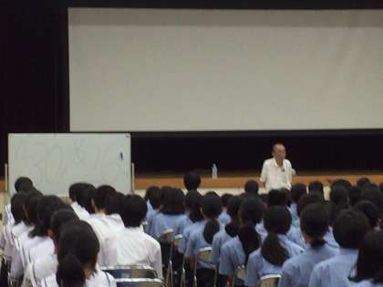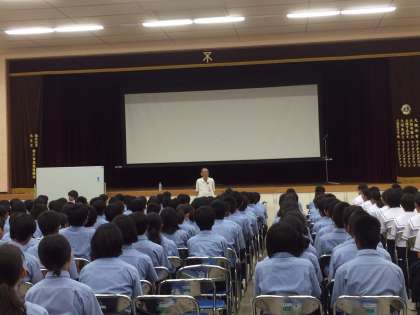 校長先生のお話に続いて、広島被爆体験者の飯田さんに、平和人権講演をしていただきました。