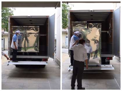 トラックが東門から入り、エレベーターホール横で、給食の入ったコンテナをおろします。