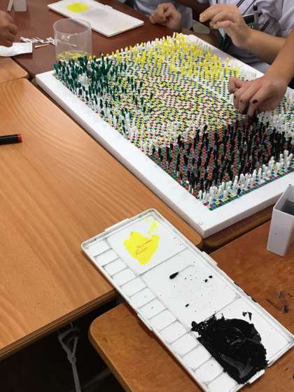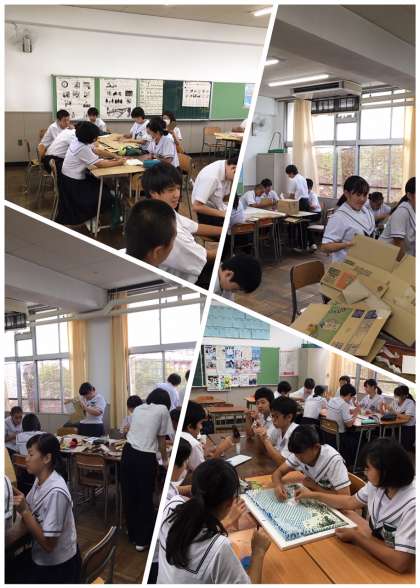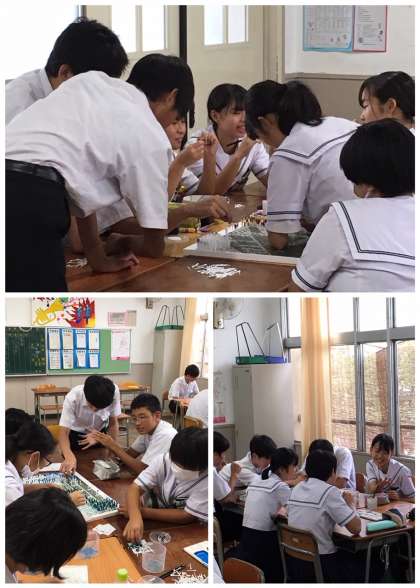 3年生もいくつかのグループに分かれ、準備を進めています。教室では、ジオラマやモザイクアートを作成しています。モザイクアートは1年生のものとはちがい、綿棒に色付けをし、立体的なものになるようです。完成が楽しみです。