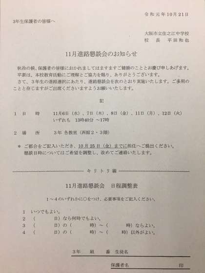 本日、3年生に進路懇談会のお知らせを配布しております。ご多用のことと存じますが、日程調整させていただきますので、よろしくお願いいたします。