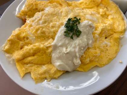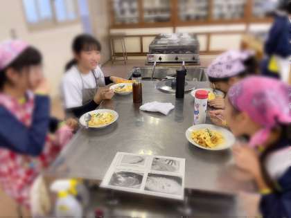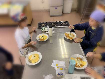 調理実習で『ふわふわ卵のオムライス』をつくりました。クリームソースを最後にかけて完成です。みんなで美味しくいただきました。