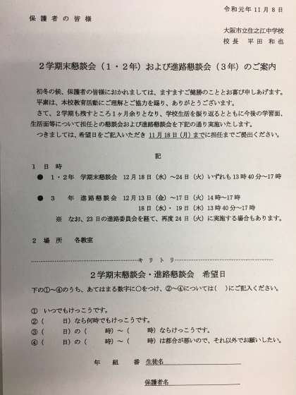 懇談会のご案内 公開日 2019/11/08 更新日 2019/11/08 お知らせ 本日、懇談会の案内プリントを配付しております。期日までにご提出していただきますようよろしくお願いします。 いいね(0)