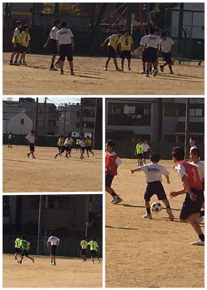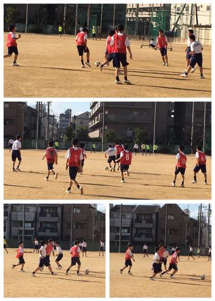防球ネットをサッカーゴールに見立ててサッカーを行なっています。昨夕の雨からグラウンド状態も回復して、思いっきり体を動かしています。