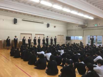 2学期最後の学年集会は、インフルエンザの蔓延予防のために行うことができませんでした。各クラスの学代さんが、2学期を振り返るとともに、3学期に向けての豊富を語る機会ももてなかったので、今日の集会での発表となりました。