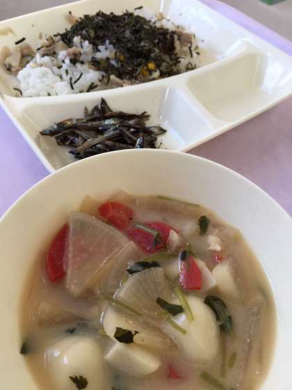 正月の行事献立です。ぞう煮には白玉もちや浪速の伝統野菜である金時にんじんを具材にし、紅白でおめでたい正月らしさを出しています。