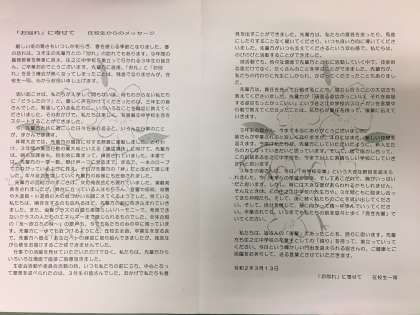 在校生からは、『お別れに』寄せて というメッセージを、送辞に替えて、印刷したものを卒業生に送りました。