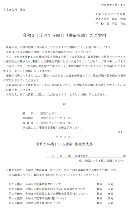 同時に配付しております資料をご覧いただき、書面表決書にご記入のうえ、来週の登校日の際に学級担任を通して提出いただくか、本校玄関にございますポストに投函いただきますよう、よろしくお願い申し上げます。