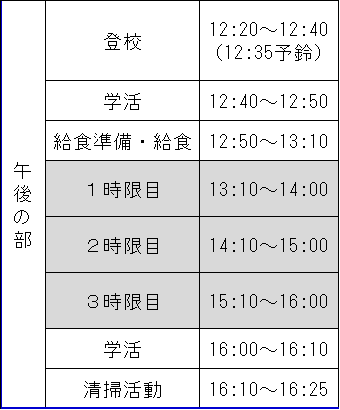 6月1日〜12日までの分散登校の授業の校時表