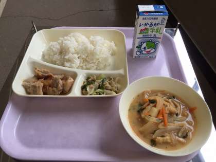 みそ汁にはじゃがいも、にんじん、玉ねぎ、大根の葉、野菜炒めにはキャベツとピーマンが食材となっており、野菜たっぷりの献立です。