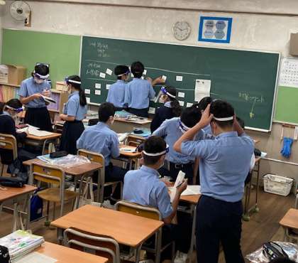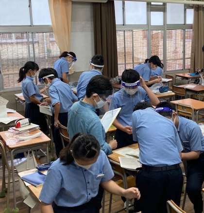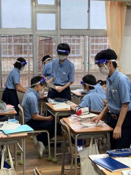フェイスシールドをつけて、いきいきとグループ学習に取り組んでいます。新しい生活様式をふまえた学習様式です。