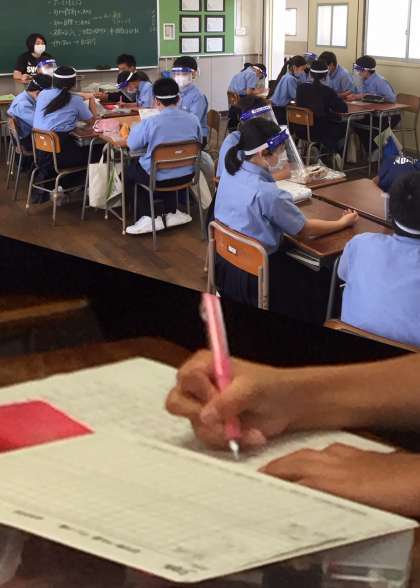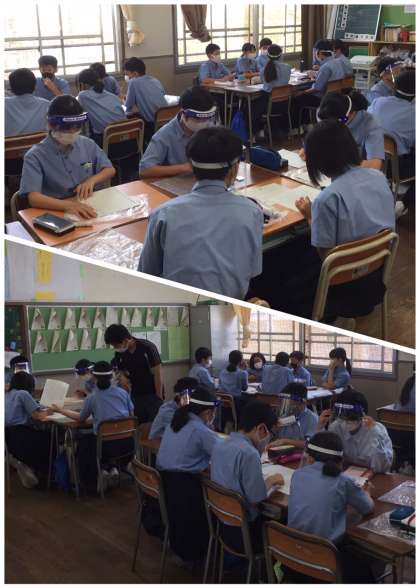 1年生では、1限に班活動を行い、班の目標などを話し合いました。これまでは、全員が前を向いて授業を受けていましたが、顔を向かい合わせての協働学習でした。