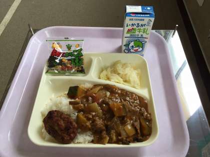 かぼちゃやナス、ピーマンなどの夏野菜がたっぷりと入ったカレーライスです。ミニハンバーグをのせていただきます。