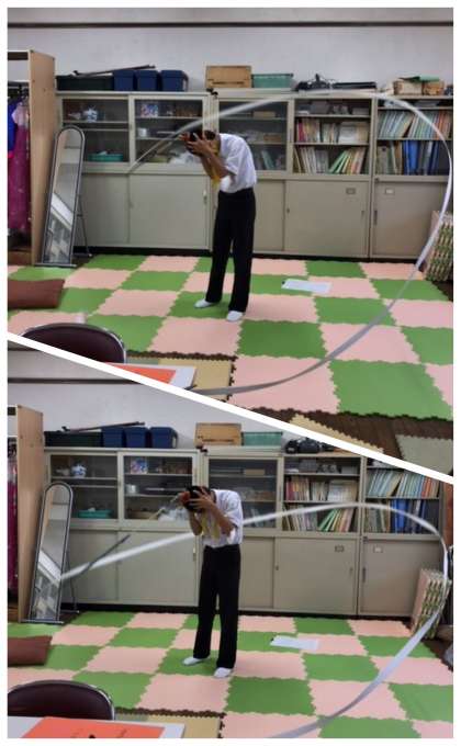 帽子の先についた紐を身体や周りに当たらないようにしながら上手にくるくる回しています。