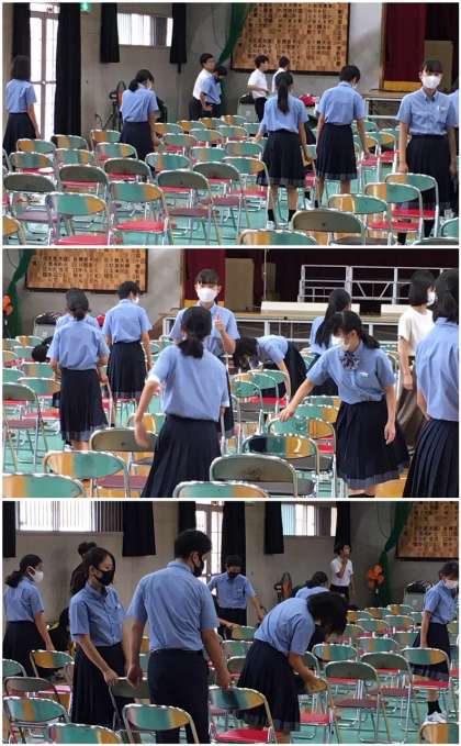 体育館の2階では生徒席の設営が進んでいます。例年よりも座席の間隔をあけて並べ、最後にメジャーを利用してまっすぐになるように仕上げを行っています。