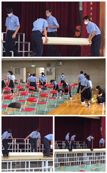 明日の文化発表会に向けて、午後から係の生徒と教職員が協力して準備を行なっています。