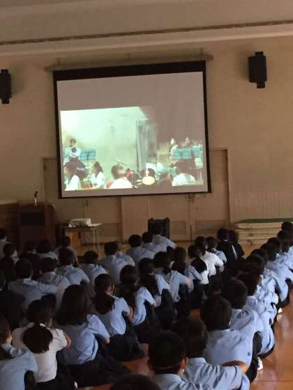 1年生は、文化発表会の舞台発表の撮影動画を体育館1階で鑑賞した後、学年の取り組みを行いました。