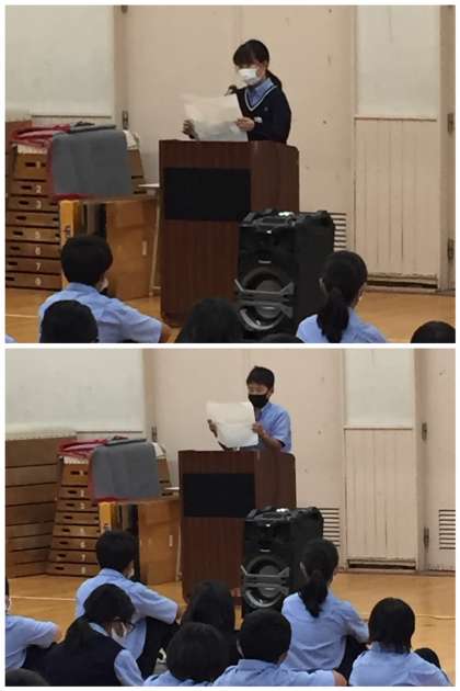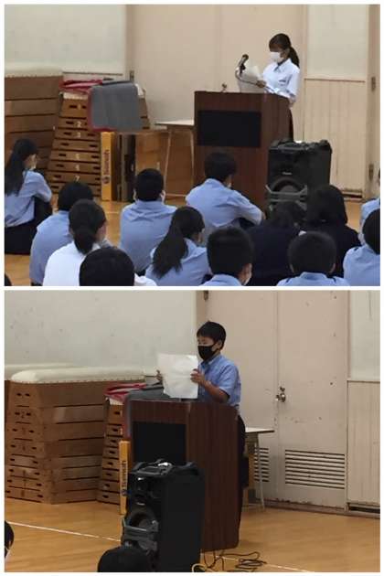 『中学生の主張』ということで、各クラスから選ばれた代表生徒が指定されたテーマをもとにスピーチを行いました。