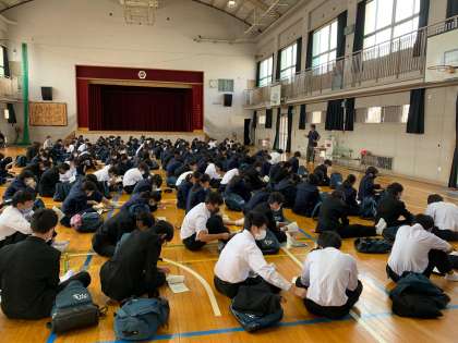 明日からの修学旅行に備えて、体育館で事前指導を行なっています。しおりを見ながら、行程や注意事項などを確認します。給食後に下校となります。集合時間が早いのでしっかり睡眠をとっておきましょう。