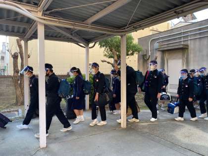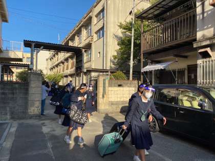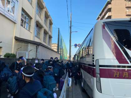 体育館を出て、クラスごとにバスに乗車しています。