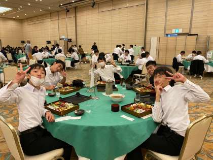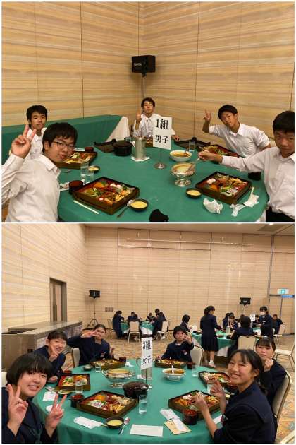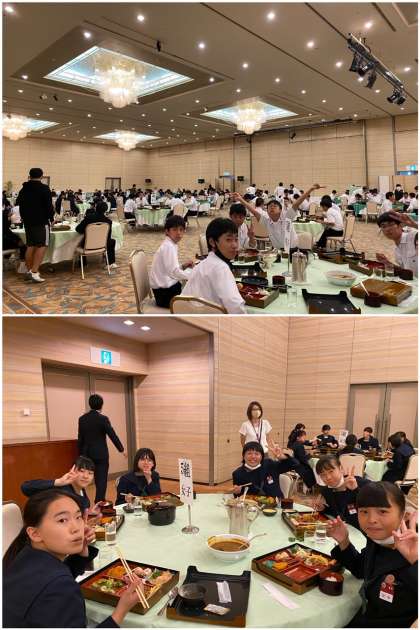 夕食の時間です。バスでの移動やラフティングの疲れもあるでしょうが、元気に食べています。
