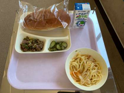 牛肉のカレー風味焼き 帆立貝とトマトのスープスパゲッティ きゅうりのサラダ 黒糖パン 牛乳