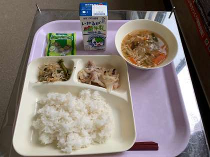鶏肉のゆず塩焼き ソーキ汁 もやしとさんどまめの甘酢あえ 抹茶大豆 米飯 牛乳