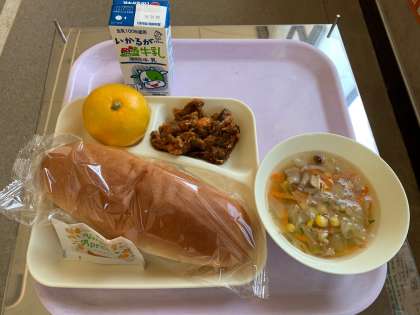 なすのミートグラタン 鶏肉と野菜のスープ みかん コッペパン アプリコットジャム 牛乳