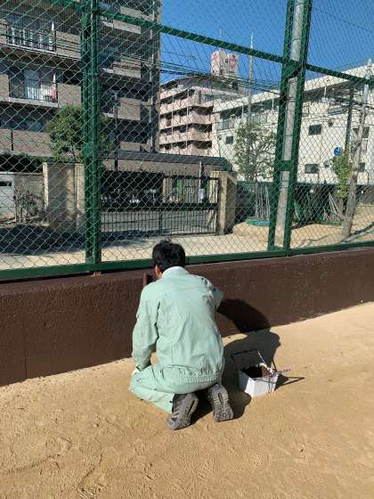 管理作業員さんがバックネットのフェンス部分と基礎のコンクリートの部分の塗装をしてくれました。塗装をしたところは校舎から見てもあざやかに見えます。