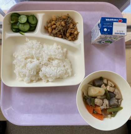 ごはん、牛乳、鶏肉と野菜の煮物、じゃこ豆、あっさりきゅうり