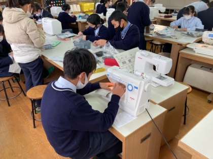 1年生は、被服室でペットボトルホルダーの作成をしています。針と糸で器用に縫い合わせたり、ミシンを上手に使っていました。