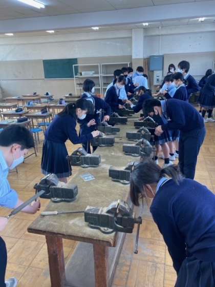 2年生は、製図室で金属製の指輪の作成をしています。額に汗を浮かべながら、一心不乱にヤスリをかけていました。世界に1つしかない素敵なものを完成させてください。