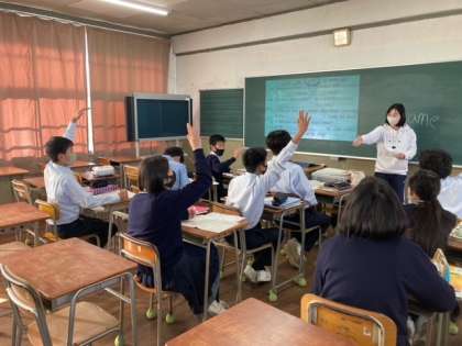 1クラスを2つに分けて授業を行っています。過去形の疑問文、否定文について、先生の質問に対して積極的に答えています。質問や発言がしやすいのも、少人数授業のメリットです。