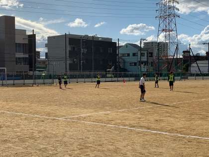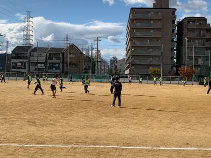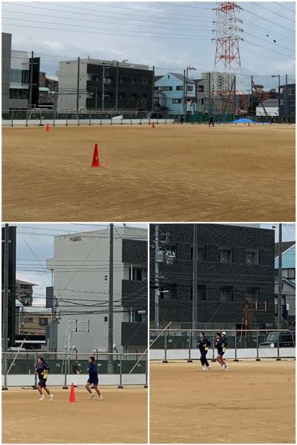 運動場では、体育の授業で1年生の男子はサッカーを、3年生の女子は長距離走を行なっています。