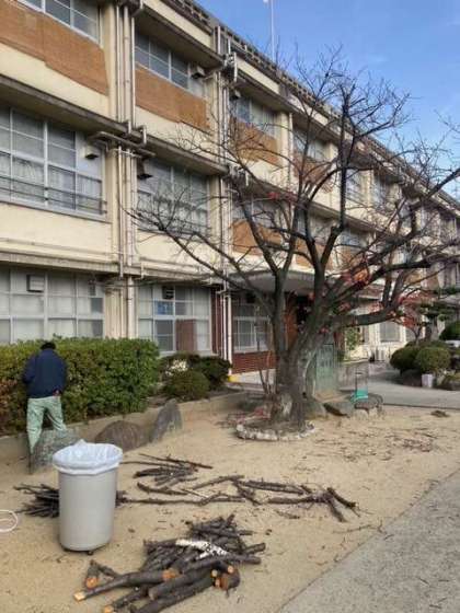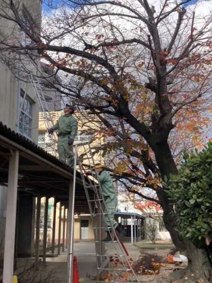 冬の到来に備えて、営繕園芸事務所の方々に桜の木の枝の剪定をお願いし、管理作業員さんに大きな枝を処理していただきました。