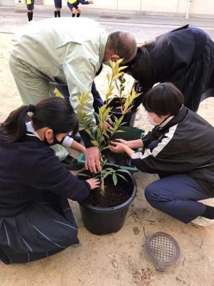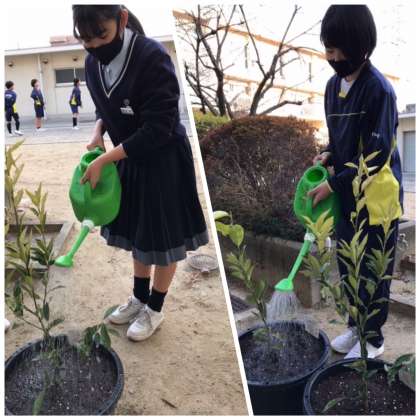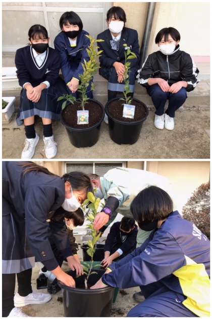 「緑の募金」の交付金で購入した「キンカン」と「小みかん」の苗木を生徒会で鉢に植え替えました。大切に育てていきます。池の横で育てているので、みてください。