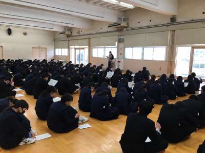 明日の私立高校入試に向けて、3年生は体育館で前日指導を行いました。進路担当の先生からはプリントをもとに、受験に際しての注意や確認がありました。今夜はしっかり食事と睡眠をとって備えてください。